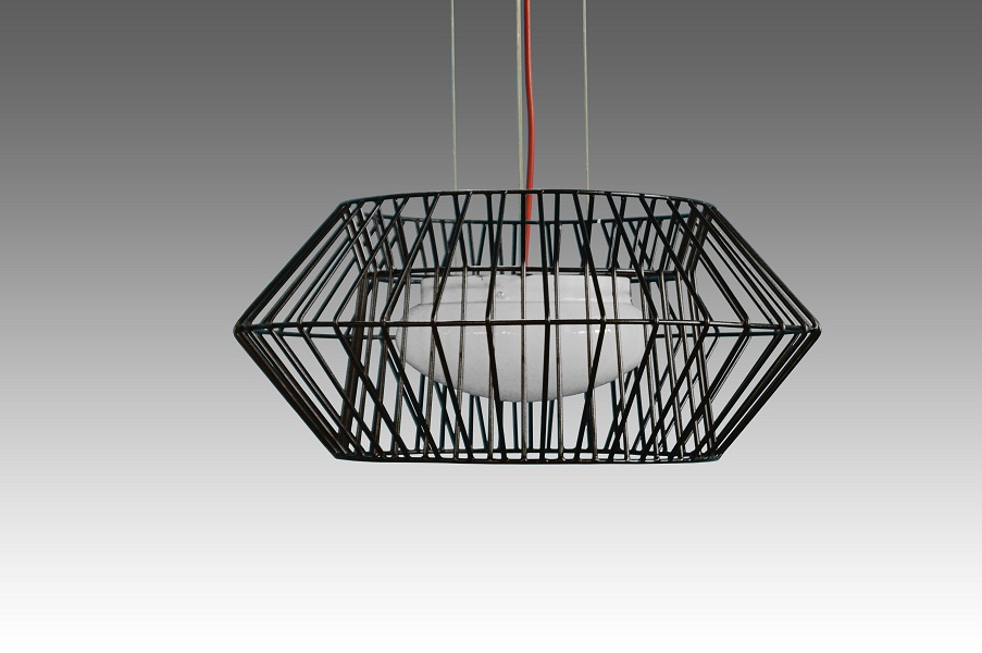 Lampara mos. Viri fabricada con alambron de acero terminado con pintura electrostatica y pantalla de tela